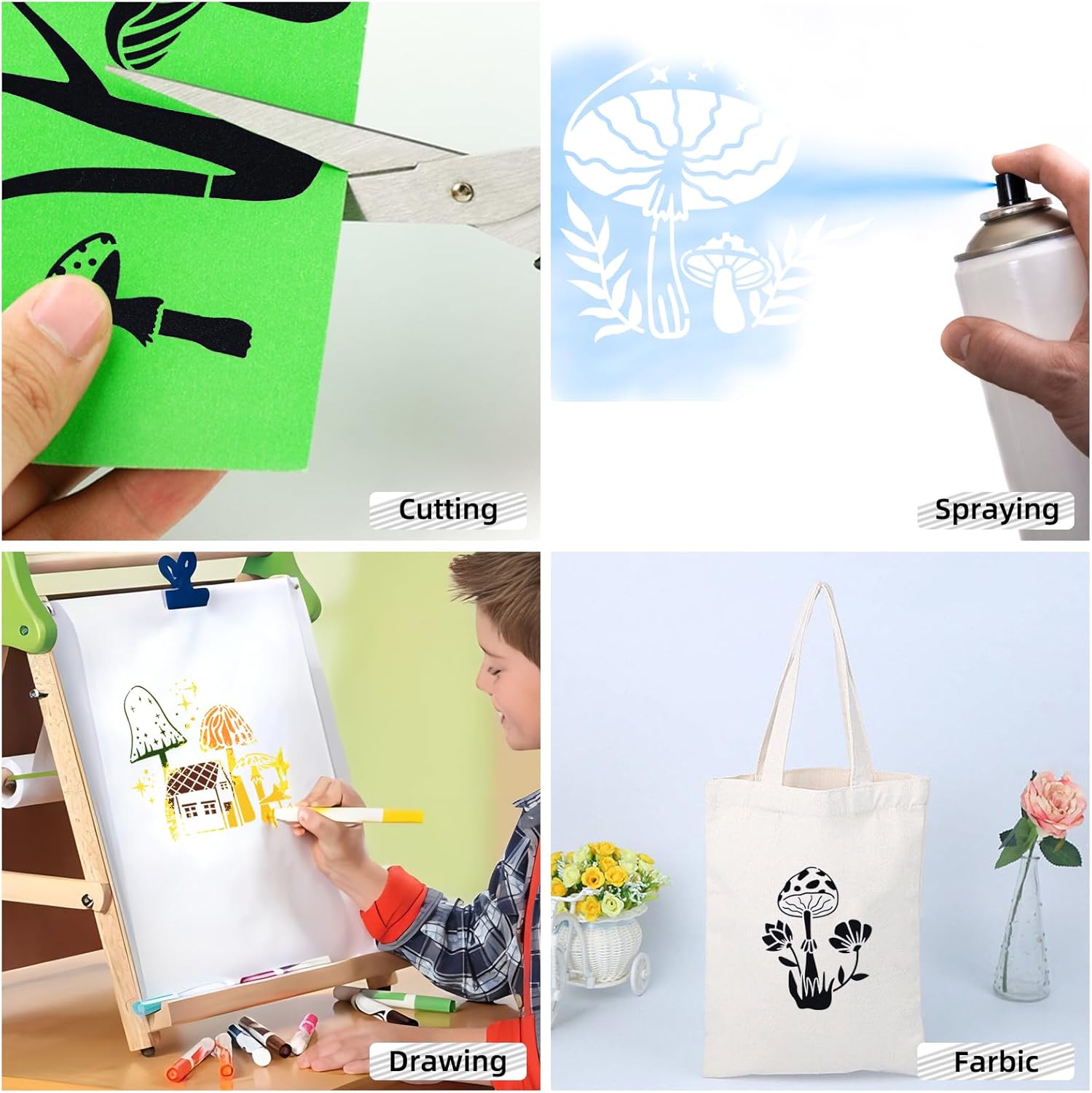 - 【Wide applications】 The reusable mushroom painting can be used for many occasions, like home decoration, school banner, painting crafts, window decor, wedding decor ect. Suitable for most smooth surfaces, such as wood, wall, fabric, metal, glass, paper, canvas, floor, etc.